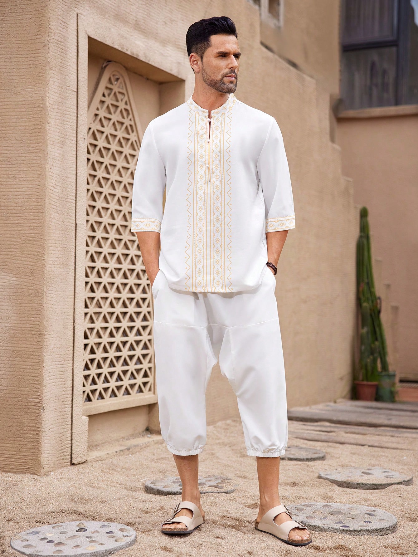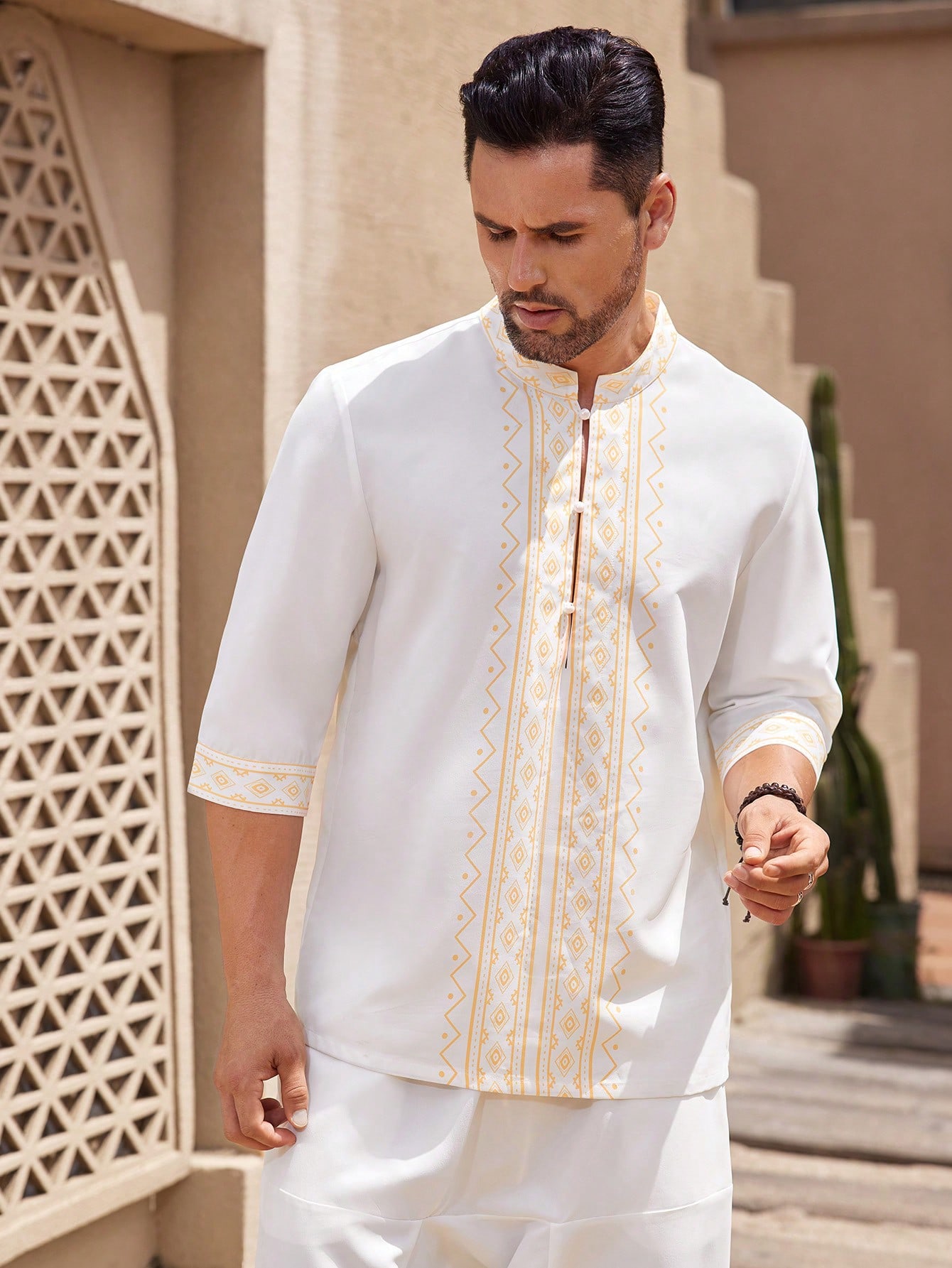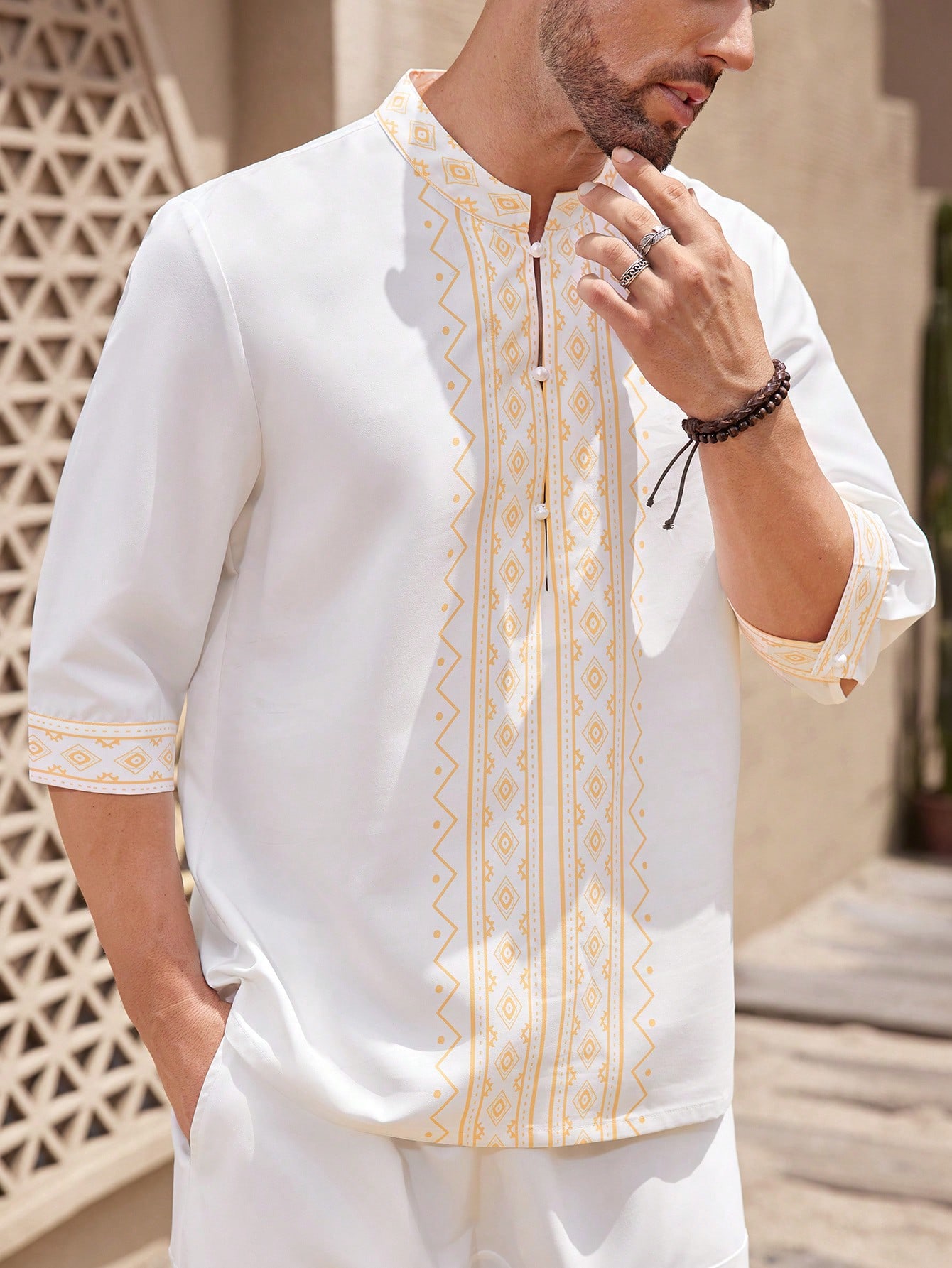 Manfinity KASUA Men??s Geometric Print Stand Collar Shirt And Pocket Shorts Casual 2-Piece Set