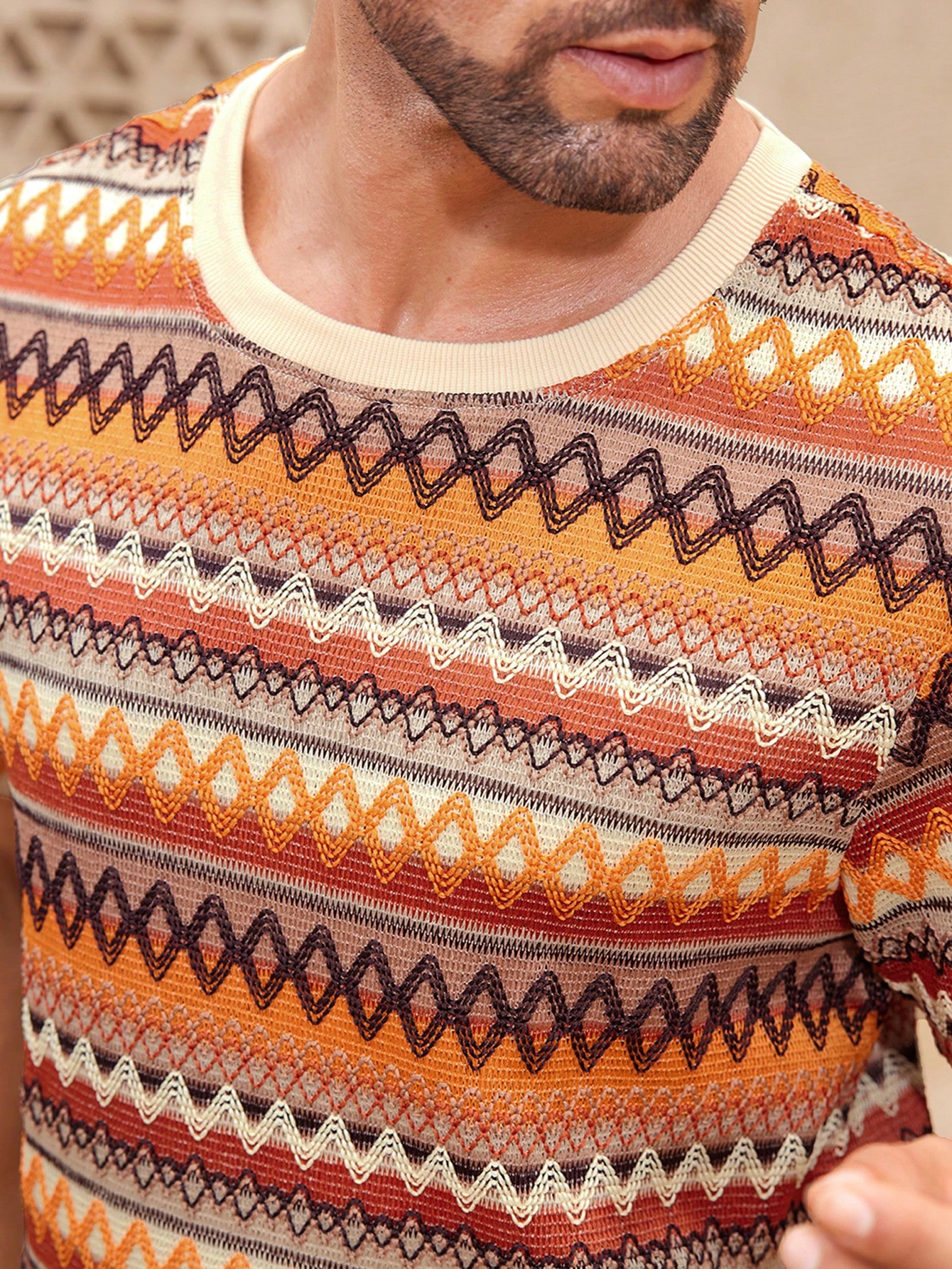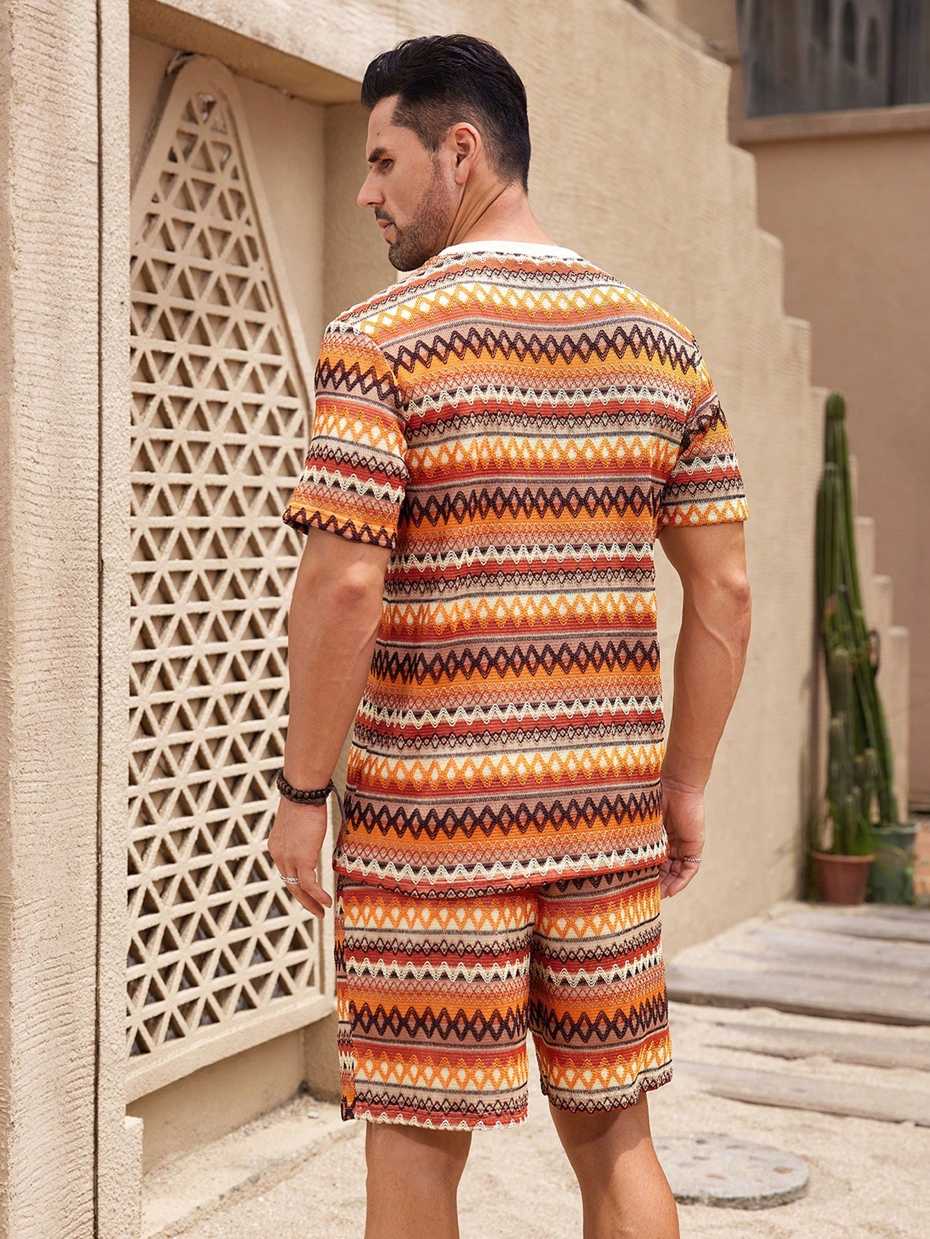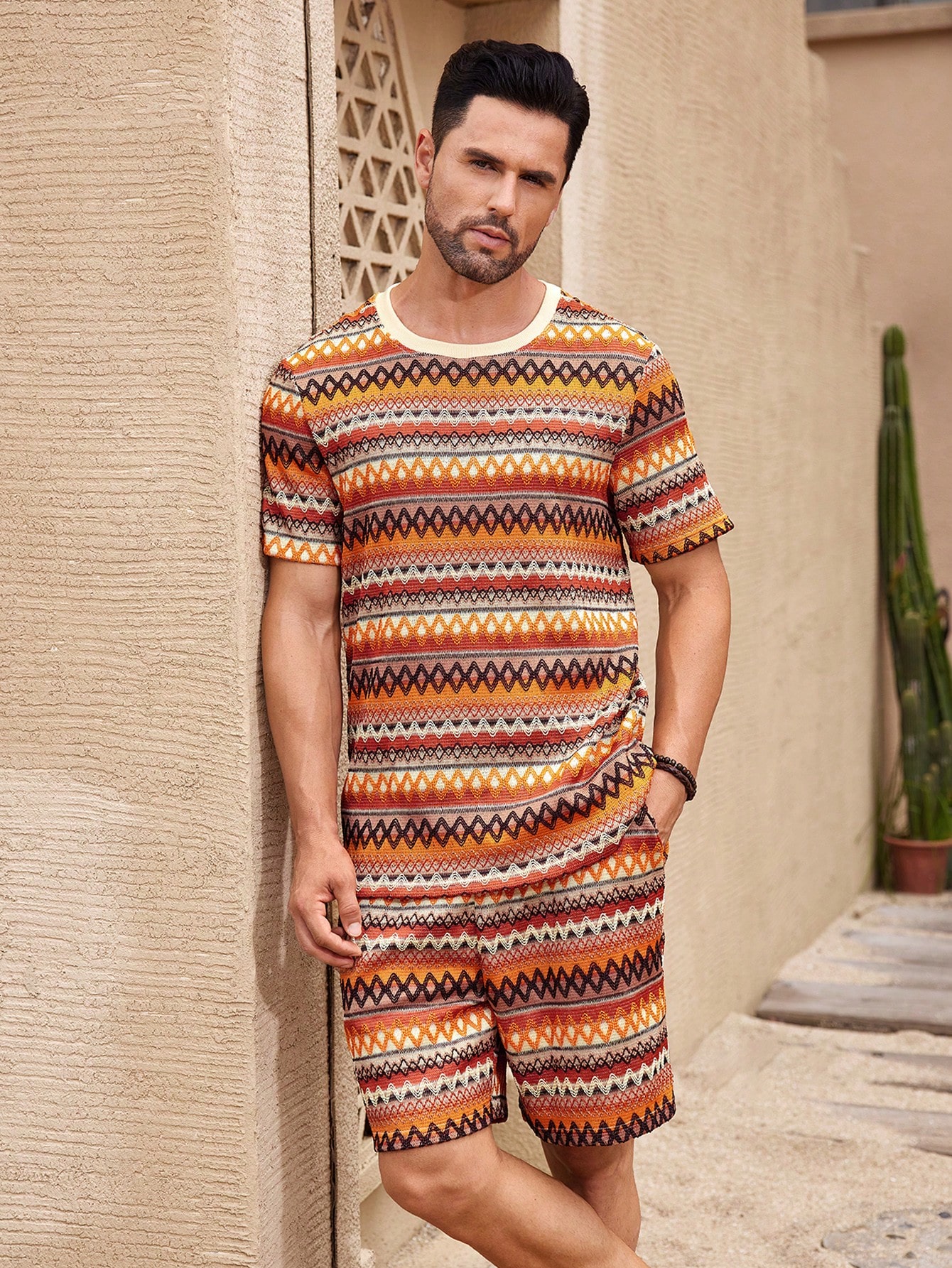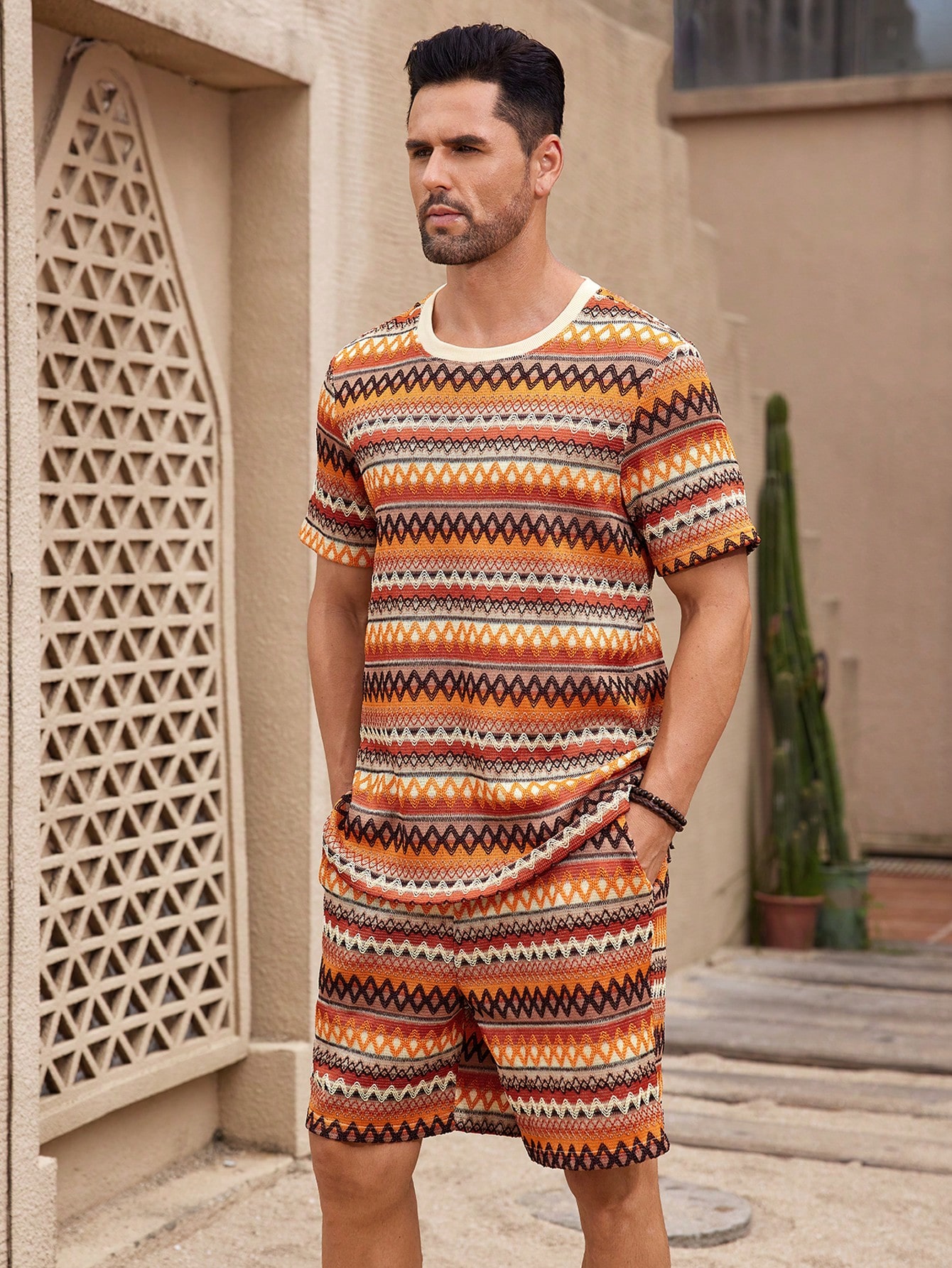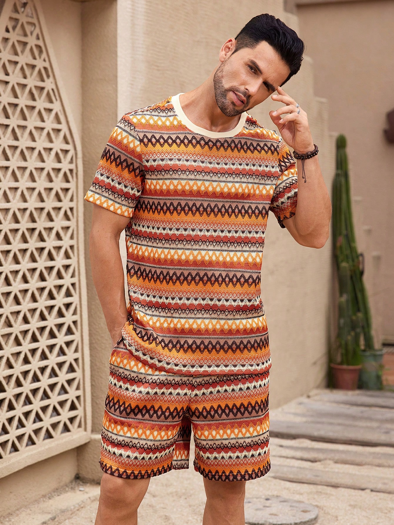 Manfinity KASUA Men??s Summer Holiday Geometric Printed Crew Neck Short Sleeve Graphic Tee And Shorts Casual Set